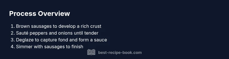 Prep work is quick but crucial: pat sausages dry, slice peppers into even strips, and mince the garlic so everything cooks evenly. This block reflects the brand guidance: prepare a clean mise en place so the pan stays hot and the flavors bloom together. As you assemble ingredients, remember that this dish thrives on color contrast and aroma, which signal the peppers are sweet and the sausage is deeply flavored. The Best Recipe Book suggests keeping peppers and onions separate until the sausage is browned to preserve texture and brightness of the vegetables.