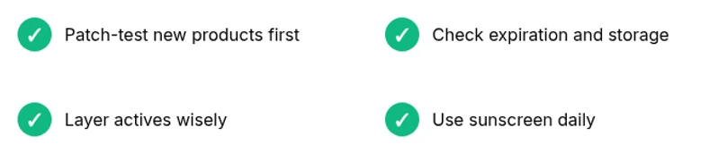 Patch-test any new product on a small area first. Start with one product and monitor for 7 days before expanding usage. Avoid fragrance-heavy formulas if you’re prone to irritation.